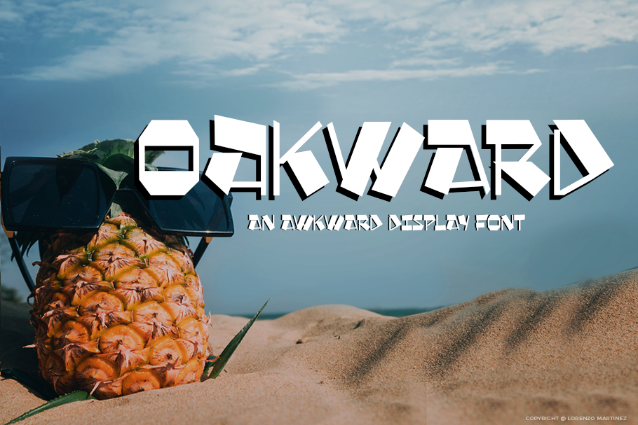 OAKWARD is a display font is made strictly from sharp angles. The idea of this font is to appear playful, awkward, tropical, and somewhat "meme-like" font.